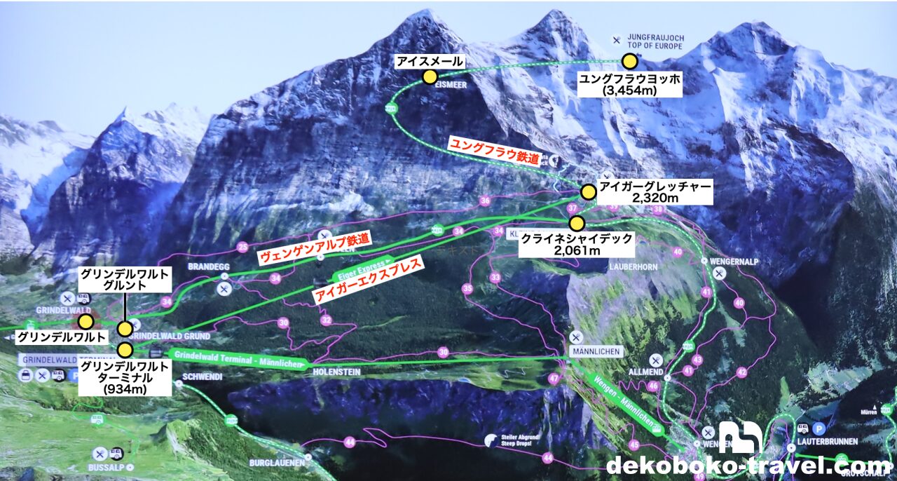 - 8:00- 列車移動 グリンデルワルト発→(アイガーエクスプレス)→アイガーグレッチャー→(ユングフラウ鉄道)→9:45 ユングフラウヨッホ着