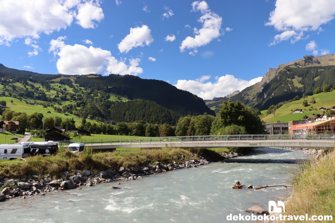 インターラーケンの街はそんなに大きくなく、駅から少し歩くと近くに綺麗なエメラルドグリーンの川が流れていて、お土産屋さんが点在するような街でした。