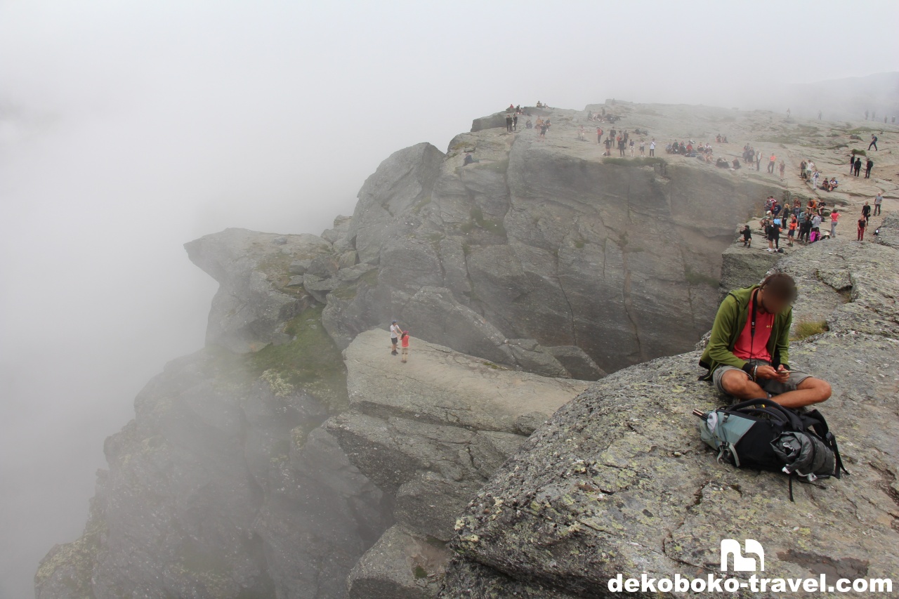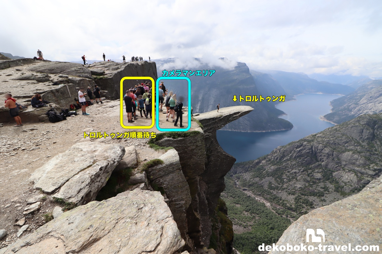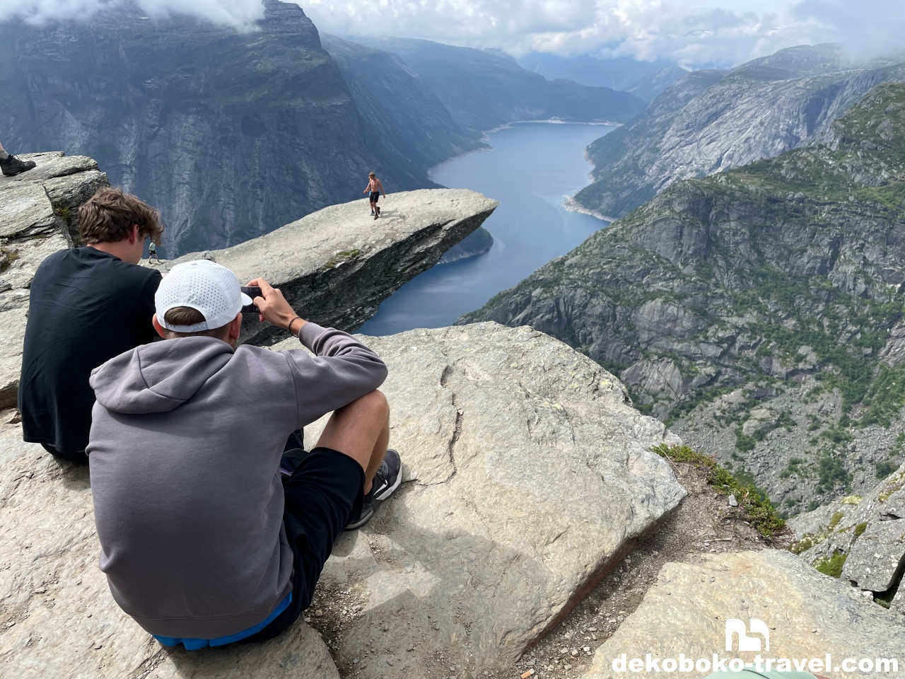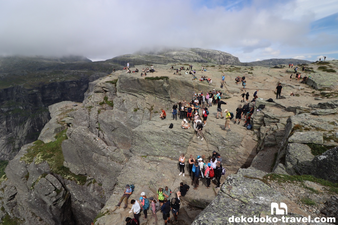 ちなみに私も高所恐怖症ですが、写真からも分かるようにトロルトゥンガの上を実際に歩いてみると、少し上り坂になっていて先が見えないのと、結構幅が広いので全然怖さは感じませんでした。逆に、カメラマンエリアの方が断崖から撮影する必要があるため、そっちの方が危険かもしれません。
