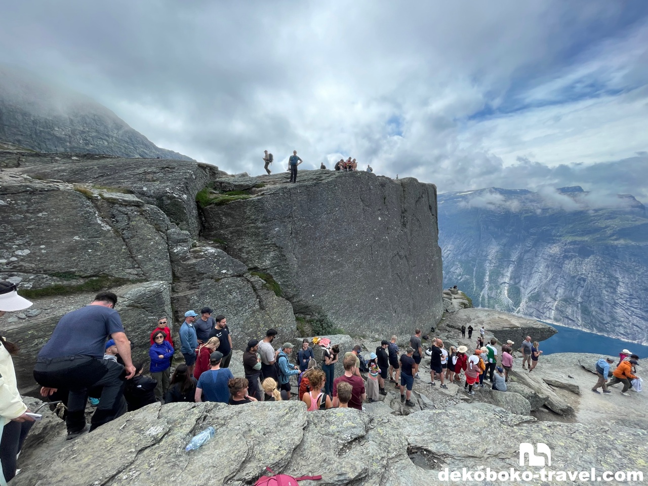 トロルトゥンガに着いたら、多くの人は舌の上に乗って記念撮影をすると思いますが、日中はかなりの行列になります。私達が到着した10時頃は、まだそれほど人が多くなかったため、15分程度待てば撮影できそうでした。
